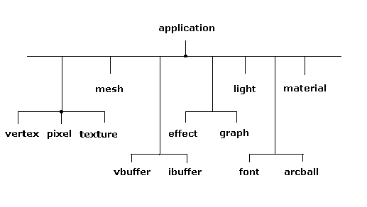 application is the root of other objects. You can think it as a game environment. vertex object is an instance of vertex shader; pixel object is an instance of pixel shader; and texture is an instance of texture shader. The mesh object inherits from the application deals with the mesh procecessing. The vbuufer and ibuffer handle the vertex buffer and the index buffer. Finally, the light and material objects work for the lights and materials in the fixed-function shaders.